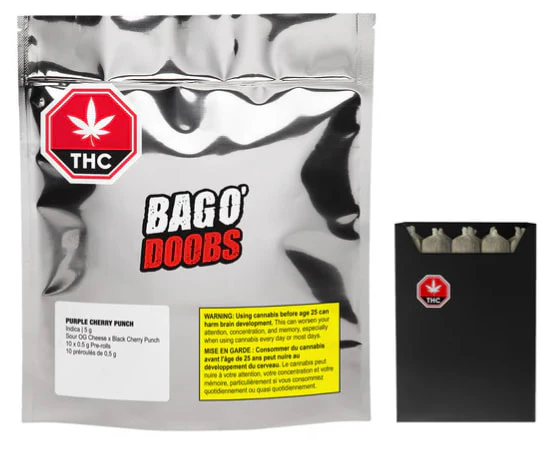 Purple Cherry Punch Bag o' Doobs offers 10 cone-style 0.5g pre-rolls, rolled with hemp paper for a smooth, premium experience. This indica-dominant is a cross of Sour OG Cheese x Black Cherry Punch, boasting sweet grape, berry, and floral aromas with dominant terpenes like ?-caryophyllene, limonene, and humulene. It’s a flavourful choice for those who appreciate big flavour, quality and convenience.