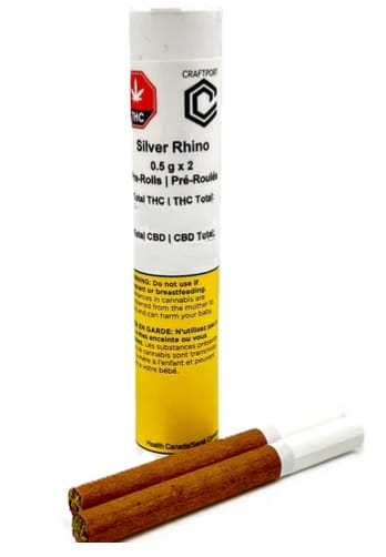 Craftport Cannabis' Silver Rhino straight-style pre-rolls are a smooth smoke throughout. Silver Rhino features a gassy flavour and aroma, including caryophyllene, myrcene, and limonene terpenes.